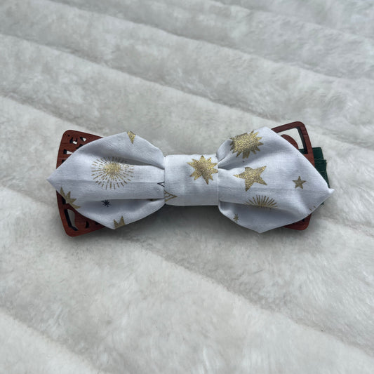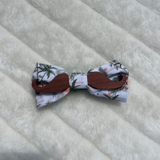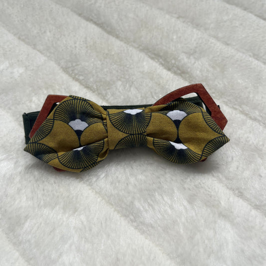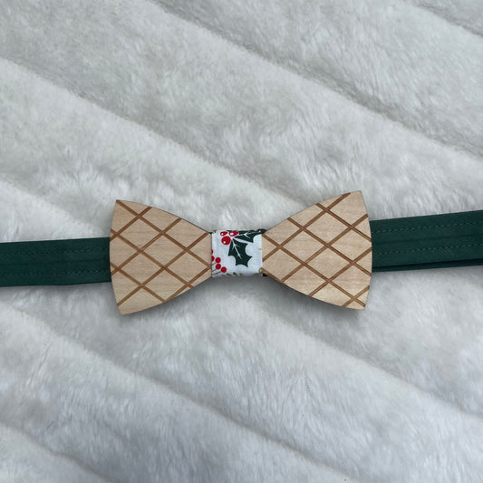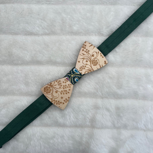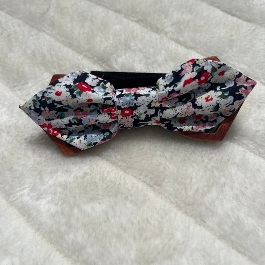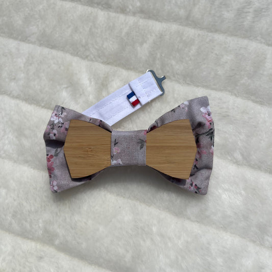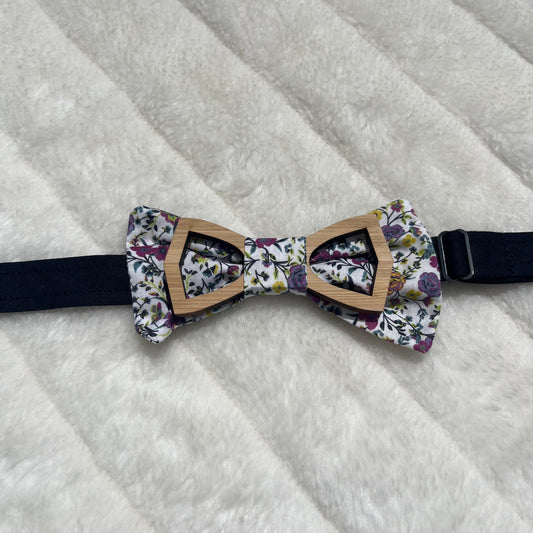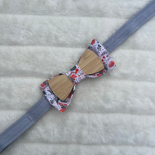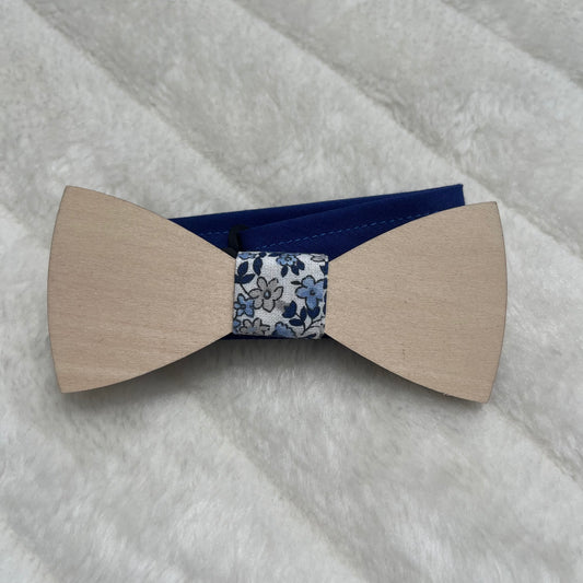 Nœud papillon bois gravé theme forêt et tissu fleuri bleu