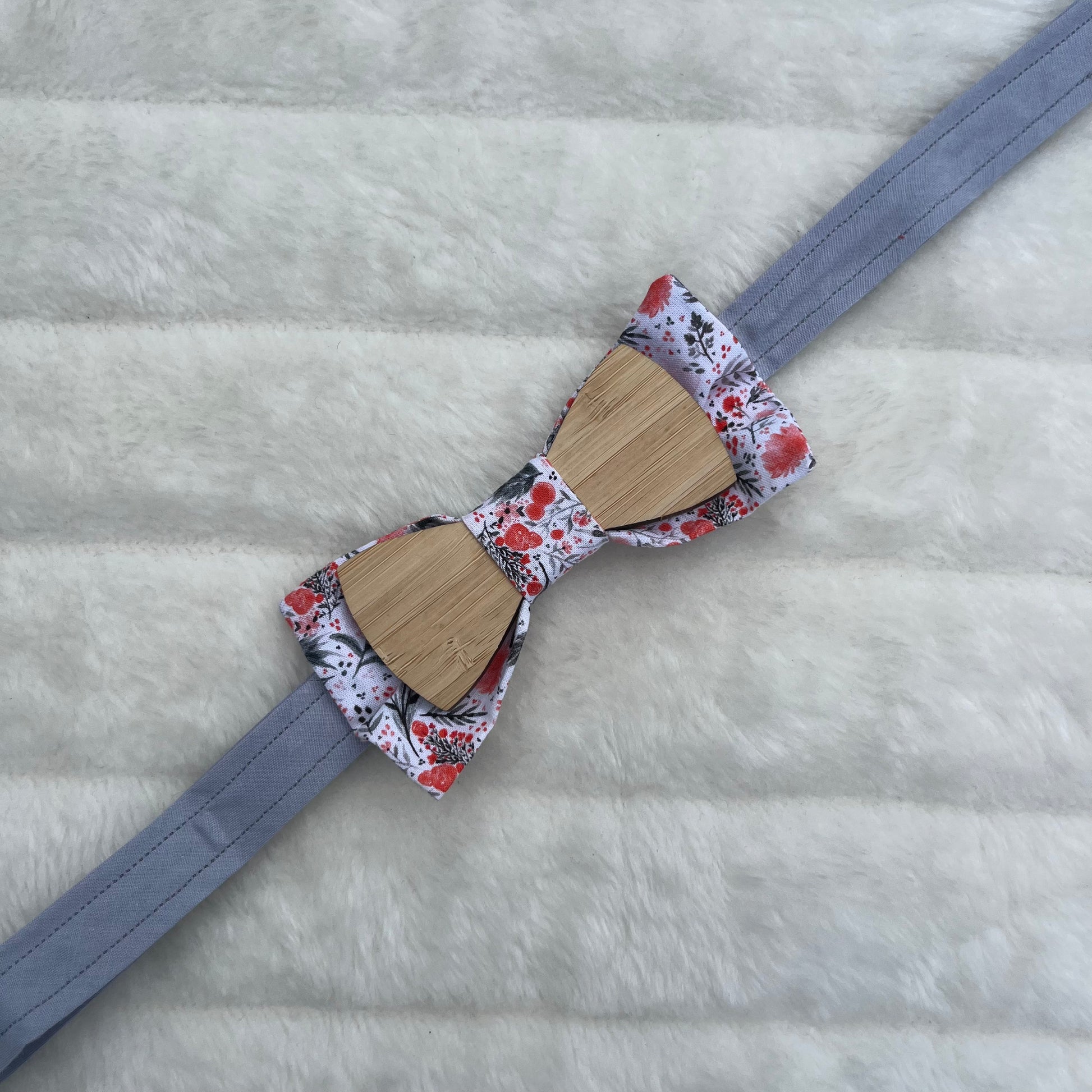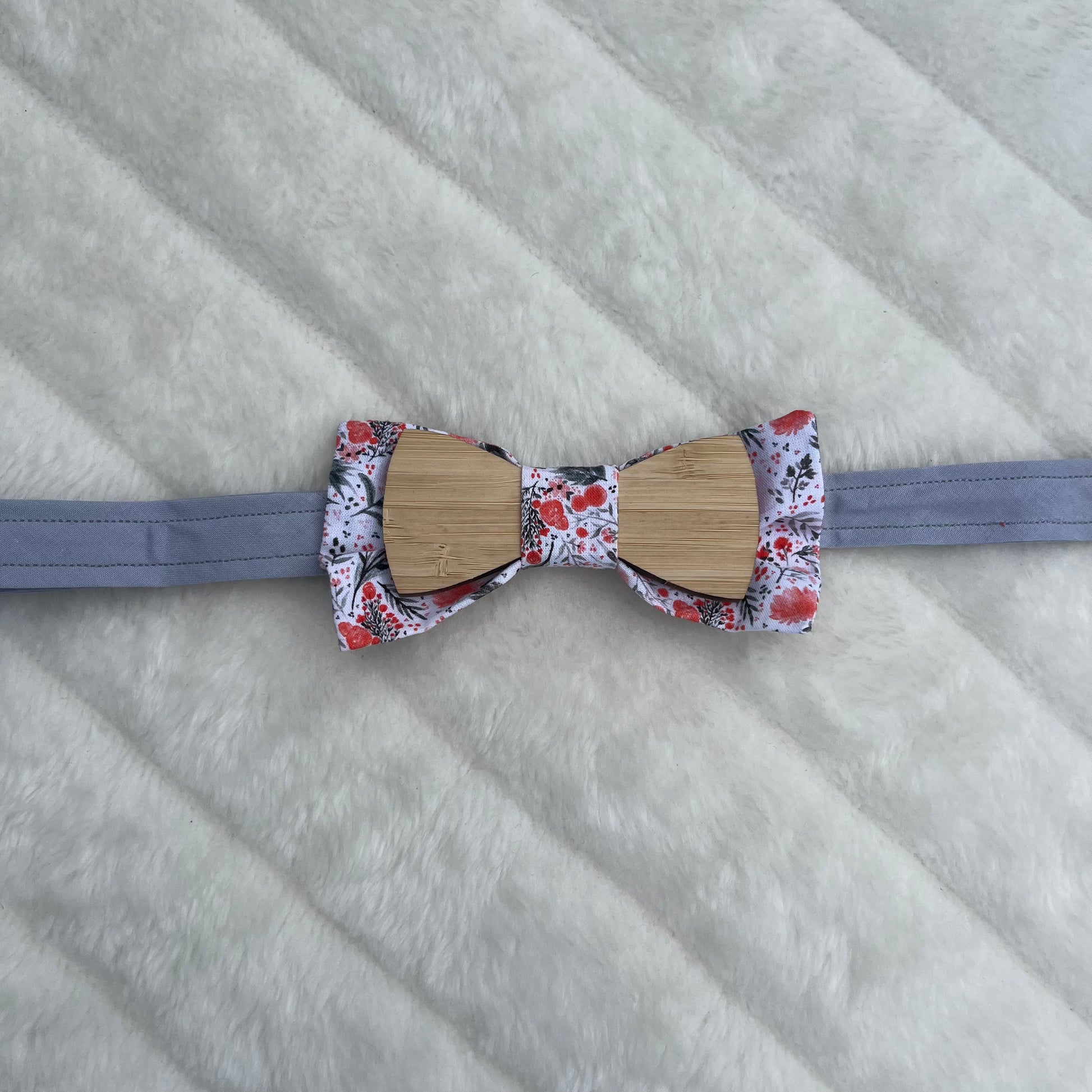 Ce magnifique nœud papillon en bois et tissu fleuri, saura surprendre lors de mariages ou d'événements habillés.