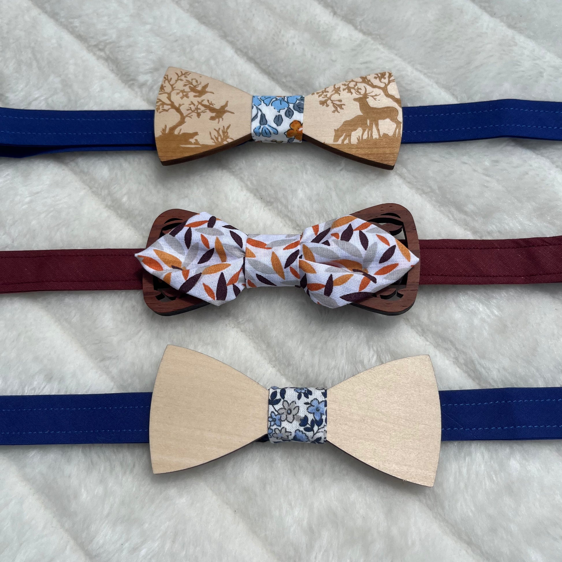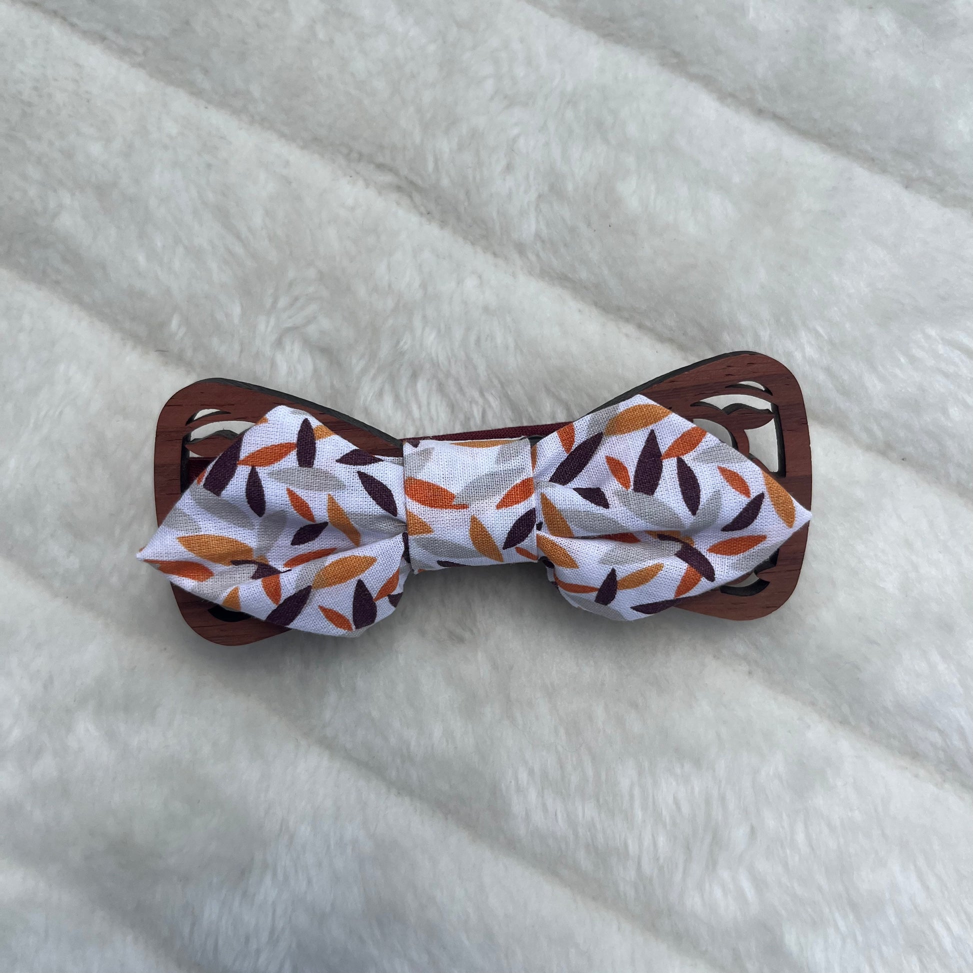Ce magnifique nœud papillon blanc, mélangeant bois sculpté, et tissu en coton à motif automnal, saura surprendre lors de mariages ou d'événements habillés.