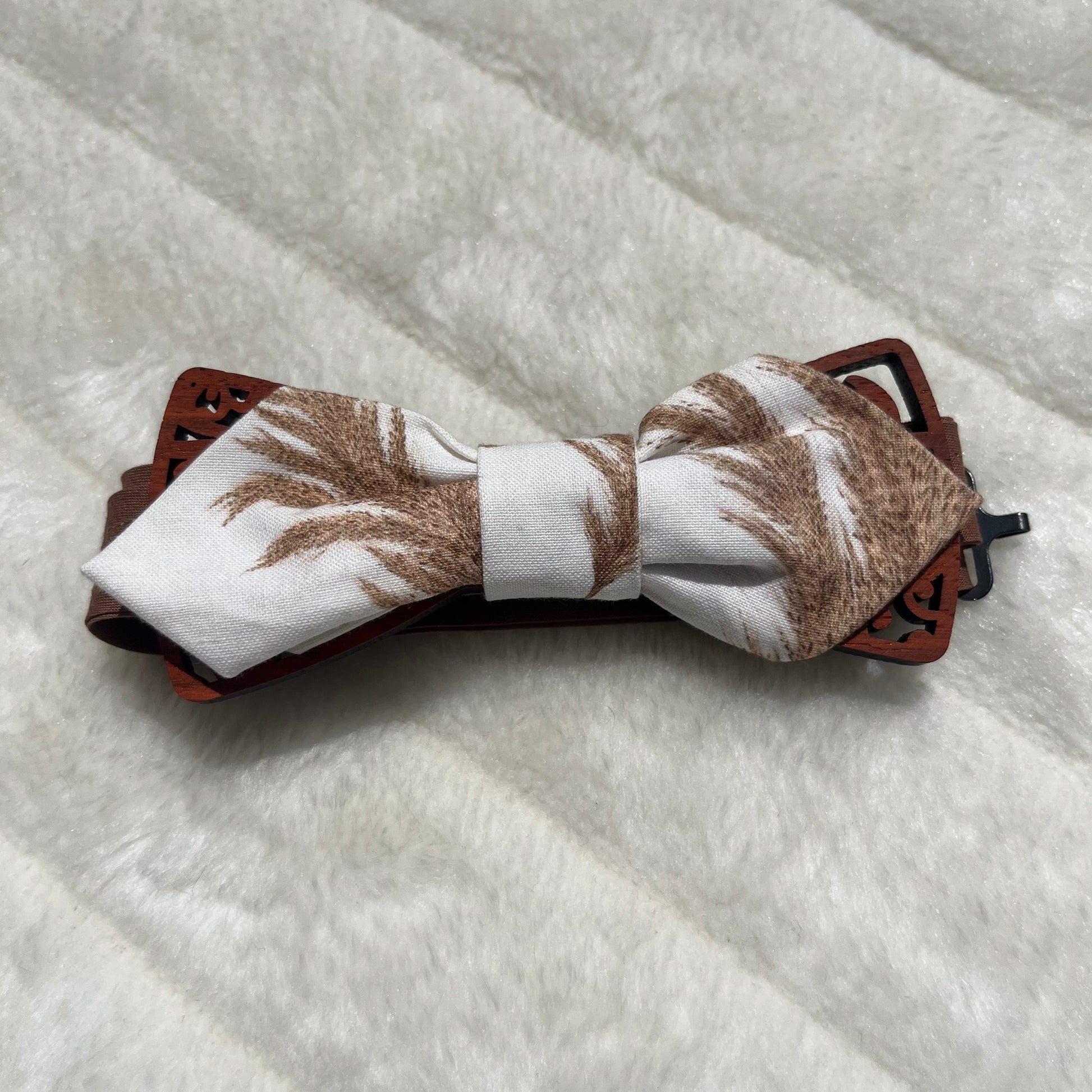 Ce magnifique nœud papillon blanc, mélangeant bois sculpté, et tissu en coton à motif blé, saura surprendre lors de mariages ou d'événements habillés.