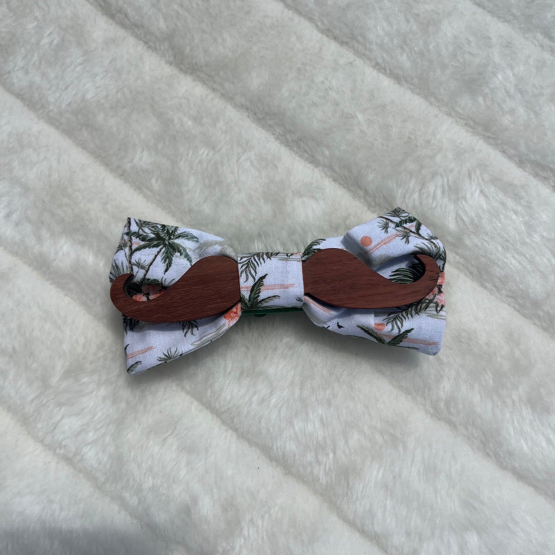 Ce magnifique nœud papillon, mélangeant bois sculpté en forme de moustache et tissu tropical, saura surprendre lors de mariages ou d'événements habillés.