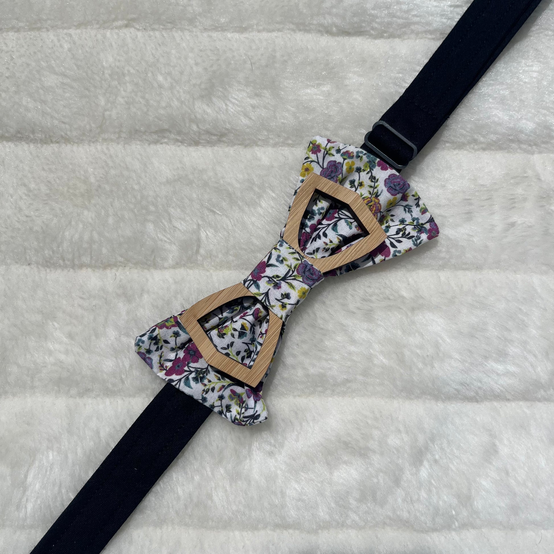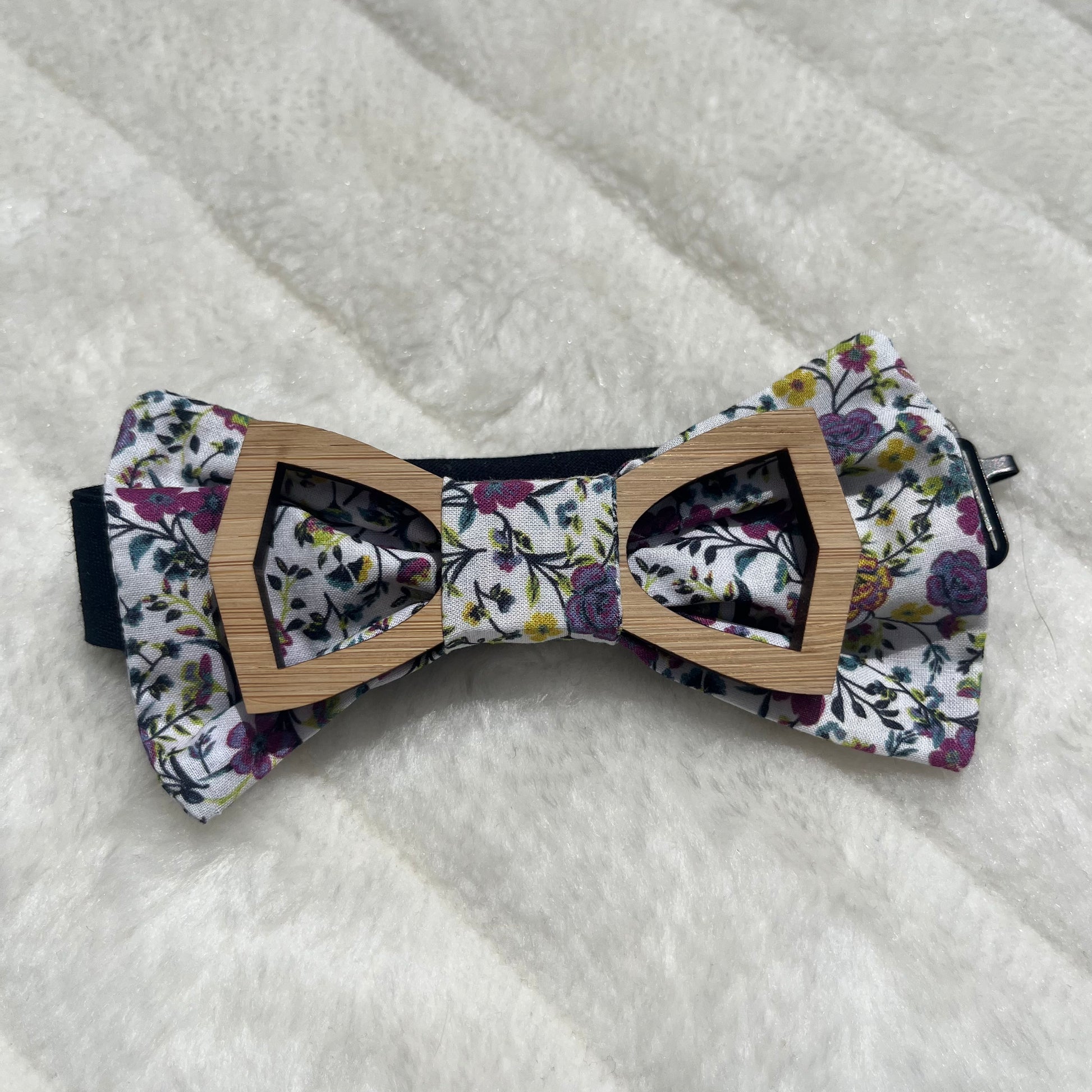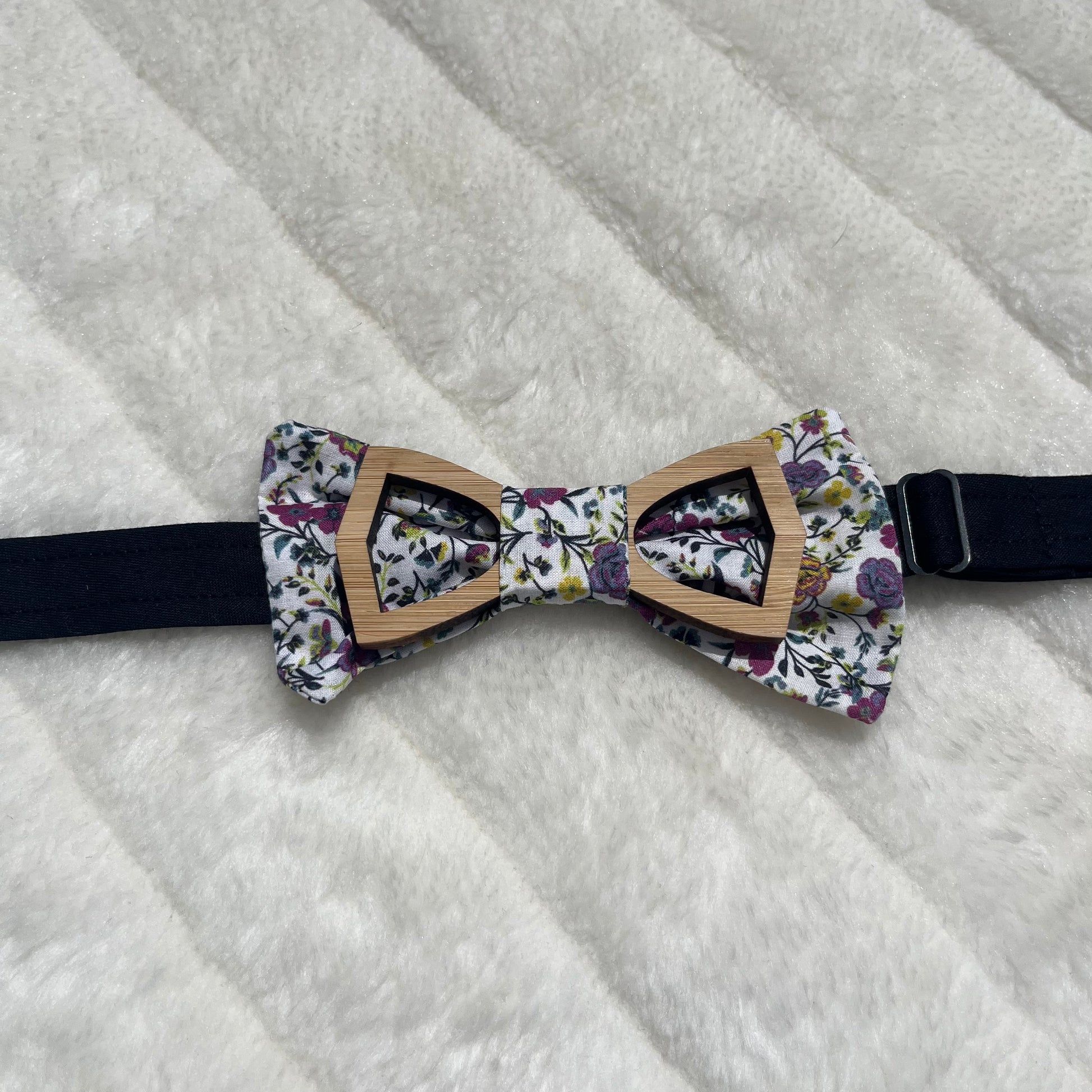 Ce magnifique nœud papillon en bois et tissu fleuri, saura surprendre lors de mariages ou d'événements habillés.