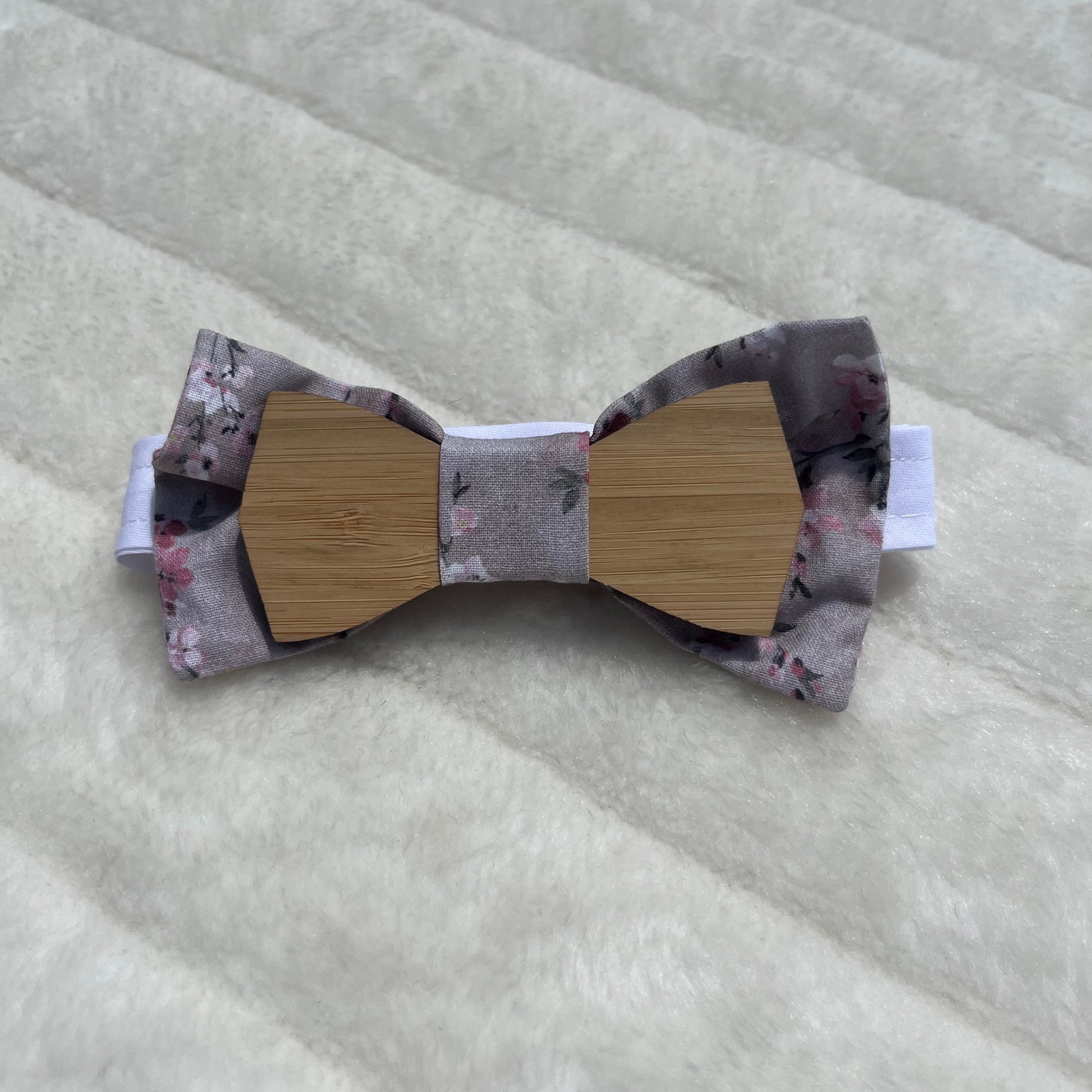 Ce magnifique nœud papillon gris, mélangeant bois et tissu en coton à motif fleuri, saura surprendre lors de mariages ou d'événements habillés.